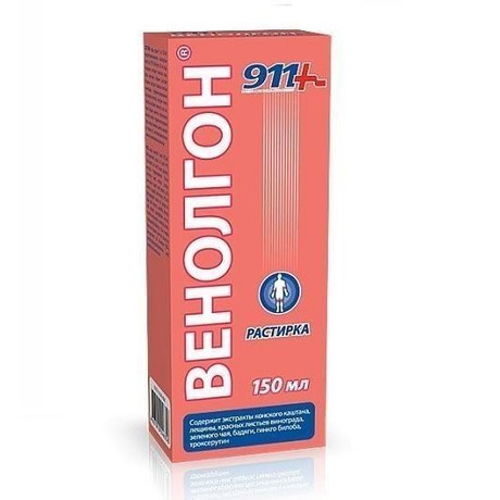 Другие формы «911 Венолгон»Растирка косметическая Венолгон уменьшает отечность и боль в ногах, укрепляет стенки сосудов, делает их более эластичными, чем способствует устранению застойных явлений в ногах. Улучшает кровообращение. Рекомендуется в качестве профилактического средства от варикоза и тромбофлебита.