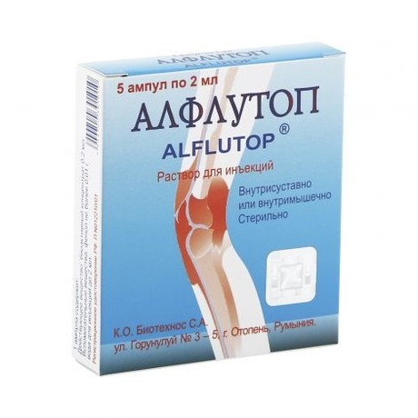 Алфлутоп - хондропротектор, активным компонентом которого является биоактивный концентрат из мелкой морской рыбы, полученный путем экстракции с последующей депротеинизацией и делипидизацией. Концентрат содержит мукополисахариды (хондроитин сульфат), аминокислоты, пептиды, ионы натрия , калия , кальция , магния , железа , меди и цинка.