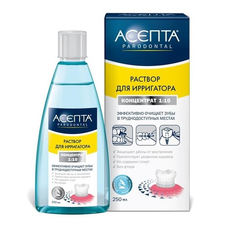 Ополаскиватель для полости рта «Асепта» — средство комбинированного действия, предназначенное для применения при инфекционно-воспалительных заболеваниях полости рта. Эффективность ополаскивателя «Асепта» обусловлена наличием в его составе бензидамина (0,15 %) и хлоргексидина (0,05 %). Бензидамин оказывает противовоспалительное и местное обезболивающее действие. Хорошо абсорбируется через слизистые оболочки и проникает в воспалнные ткани. Снижает болевую чувствительность в очаге воспаления. Хлоргексидин—антисептик широкого спектра действия, активен в отношении вегетативных форм грамотрицательных и грамположительных микроорганизмов, дрожжей, дерматофитов и липофильных вирусов. Инновационное преимущество — новая комбинация активных компонентов Ополаскиватель «Асепта» имеет впервые предложенную комбинацию противовоспалительного и обезболивающего компонента бензидамина и противомикробногокомпонента хлоргексидина.Это обеспечивает антисептическое действие ополаскивателя с одновременным снятием воспаления и болевых ощущений, что повышает эффективность и качество лечения воспаления пародонта. Ополаскиватель не содержит спирта и красителей. К ополаскивателю прилагается мерный стаканчик.