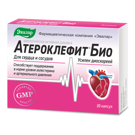 Натуральное средство Атероклефит БИО от компании «Эвалар». В его обновленном составе экстракт диоскореи, которая считается одним из самых эффективных растений для здоровья сосудов. Она усиливает кровоснабжение, расширяет сосуды, насыщая клетки кислородом и питая полезными веществами, способствует очищению стенок сосудов от «плохого» холестерина. Действие растения направлено на снижение симптоматики атеросклероза, улучшение постинфарктного состояния и смягчение последствий инсульта, повышенного артериального давления и ревматоидного артрита.