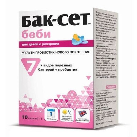 применения при различных нарушениях пищеварения и атопическом дерматите у детей грудного и раннего возраста. У различных видов пробиотиков в разной степени выражены те или иные полезные свойства; один единственный вид не в состоянии справиться с разнообразными нарушениями пищеварения. Поэтому в состав Бак-Сет Беби входят 7 разных видов пробиотиков, которые взаимодополняют действие друг друга. Также комплекс обогащен пребиотиком, который создает благоприятные условия для роста полезных бактерий. *