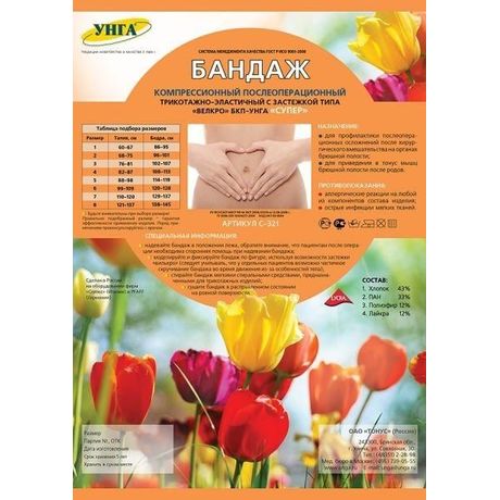 Другие формы «Бандаж БКП-Унга Супер»Бандаж послеоперационный БКП-УНГА «Супер» артикул С-321 применяется сразу после операций на брюшной полости и брюшной стенке, области почек, а также после Кесарева сечения. Бандаж обеспечивает поддержку передней и боковых областей брюшной стенки, уменьшение болевых ощущений и создает оптимальные условия для заживления и рубцевания послеоперационного шва. Благодаря компрессионному воздействию, бандаж оказывает профилактику развития послеоперационных грыж и улучшает тонус мышц брюшной стенки.