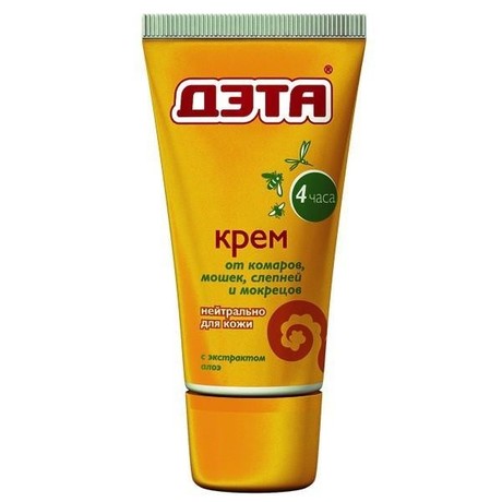 Крем Дэта незаменим для комфортного отдыха на природе. Средство обеспечивает надежную защиту от укусов комаров, мошек, слепней и мокрецов в течение 4-х часов. Благодаря экстракту Алоэ вера, крем смягчает и увлажняет кожу. Обладает приятным запахом. Не оставляет ощущения липкости.