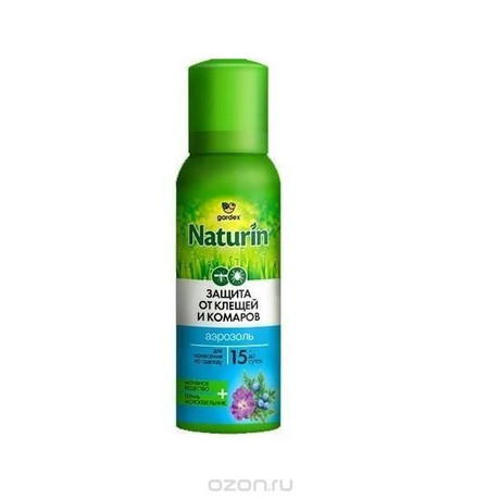 Другие формы «Гардекс Натурин»Аэрозоль Gardex Naturin от комаров и клещей предназначен для обработки одежды и снаряжения. Средство защищает от укусов комаров, мокрецов и москитов до 5 суток, от клещей - до 15 суток. Повторную обработку одежды можно производить через 10-15 суток или после стирки. Содержит эфирные масла репеллентных растений: можжевельника и герани.