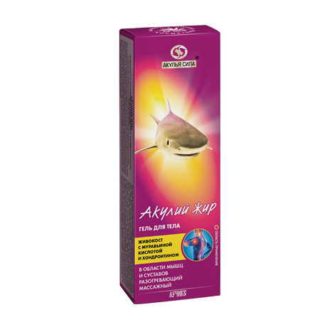 Другие формы «Акулий жир»Гель для тела рекомендуется применять при мышечных и суставных болях, скованности мышц, онемении конечностей, судорогах, невралгии, травмах (вывихах, ушибах, растяжении связок и сухожилий), а также для разогрева мышц при больших физических нагрузках и занятиях спортом. Благодаря содержанию эфирных масел и акульего жира, богатого скваламином, скваленом, алкилглицеролами, витаминами-антиоксидантами А и Е, витамином Д и омега-3 жирными кислотами, гель способствует устранению боли, воспаления и отечности в околосуставных мышцах и соединительных тканях. Экстракты сабельника и живокоста активизируют процессы обновления и восстановления соединительных тканей, укрепляют суставные связки. Входящий в состав хондроитин снижает потерю кальция, стимулирует биосинтеза гликозаминогликанов и синовиальной жидкости, ускоряет процесс регенерации суставной сумки, хрящевых поверхностей суставов и костной ткани, тормозит процесс дегенерации хрящевой ткани. За счет муравьиной кислоты, камфоры, провитамина РР и масла горчицы гель обладает разогревающим свойством, великолепно снимает напряжение и дискомфорт в мышцах и суставах, восстанавливая их подвижность.