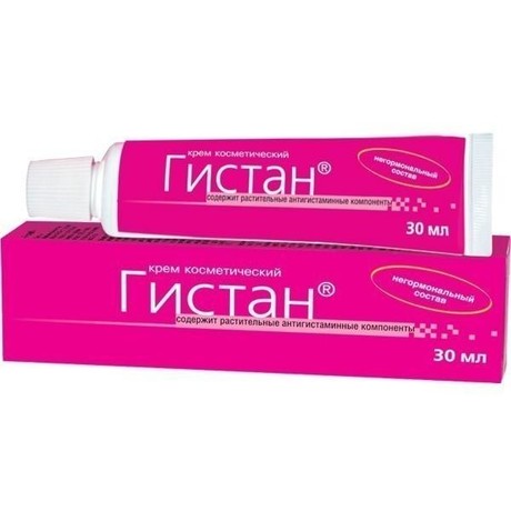 Крем Гистан - парафармацевтическое наружное средство, применяемое при аллергических высыпаниях на коже лица, рук и тела: при кожном зуде, крапивнице, везикулезных (пузырьковых) аллергических высыпаниях. Крем Гистан пиготовлен на основе гипоаллергенной базы с добавлением природного антигистаминного вещества Бетулина, получаемого из тонкой коры березы. Не содержит гормонов. Основной компонент гипоаллергенной базы - диметикон. Диметикон - это силиконовый полиглюкозид, который создает на пораженных участках кожи пленку, свободно пропускающую к коже кислород, но не допускающую влагу и аллергены. В состав крема входят также экстракты "противоаллергических" трав и эфирное масло ландыша. Молекулярная структура эфирного масла ландыша способствует его легкому проникновению в кожу, в результате чего происходит стимуляция и улучшение обменных процессов, кровообращения. Масло ландыша и экстпакты трав способствуют профилактике инфекционных осложнений при аллергических поражениях кожи за счет своих антисептических свойств.