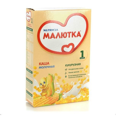 Другие формы «Каша МАЛЮТКА»Молочная кукурузная каша Малютка вкусная и сытная за счет добавления молока. Кукуруза легко усваивается, обладает высокой питательной ценностью и не содержит глютена. Она поможет нормальной работе и очищению кишечника. Каша также содержит мальтодекстрин - это углеводныйкомпонент, который обладает пребиотическим эффектом, легко переваривается в желудочно-кишечном тракте, помогает лучше усваивать витамины и микроэлементы и имеет приятный сладковатый вкус.