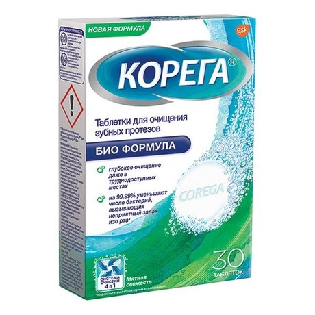 При ежедневном двухразовом использовании таблетки Корега, растворяясь, удаляют пятна с зубных протезов, которые возникли в результате употребления пищи или курения. Таблетки Корега оказывают антибактериальный и дезинфицирующий эффект и помогают предотвратить возникновение налета и воспаления.