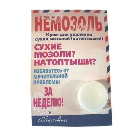НЕМОЗОЛЬ КРЕМ ДЛЯ УДАЛЕНИЯ СУХИХ МОЗОЛЕЙ - активным действующим началом средства является комбинация салициловой и бензойной кислот, которые оказывают кератолическое действие, способствуют размягчению мозолей. Бензойная кислота обладает анитисептическим действием и фунгицидным действием и может применяться длс профилактики грибковых заболеваний. Салициловая кислота способствует оторжению ороговевших клеток, а также препятствует развитию микробов и может применяться при различных повреждениях кожи ( ранки, царапины, ссадины).