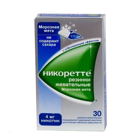 НИКОРЕТТЕ ЖЕВАТЕЛЬНАЯ РЕЗИНКА МОРОЗНАЯ МЯТА - препарат для лечения никотиновой зависимости. После резкого отказа от курения у пациентов, ежедневно использующих никотинсодержащие продукты в течение длительного времени, возможно развитие синдрома отмены, который включает в себя дисфорию, бессонницу, повышенную раздражительность, тревогу, нарушение концентрации внимания, снижение ЧСС, повышение аппетита и увеличение массы тела, а также желание курить.