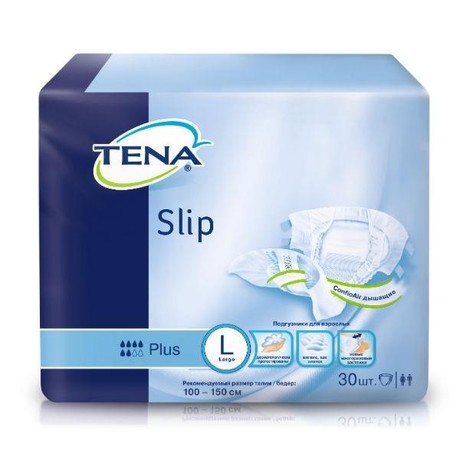 ТЕНА Слип Плюс доступны в упаковке 10 шт. и в размерах S и L, а также в уровне впитываемости ТЕНА Слип Супер.