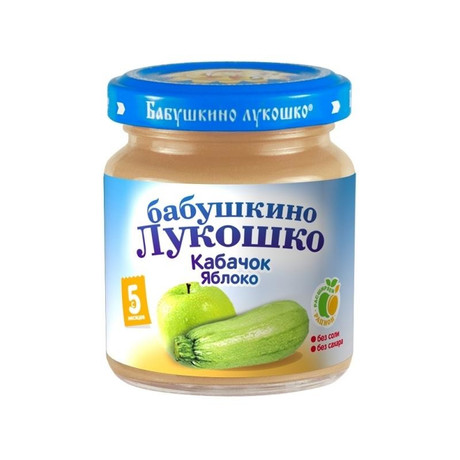 Другие формы «Пюре ФРУТОНЯНЯ»Пюре Бабушкино Лукошко Кабачок с яблоком. Сочетание кабачков и яблок позволяет обогатить рацион ребенка калием, необходимым для работы сердечной мышцы, а большое количество пектинов помогает выводить из организма токсины. Малое количество клетчатки не раздражает слизистую оболочку кишечника.