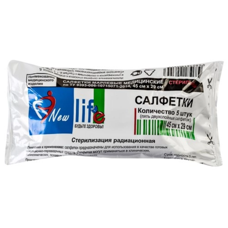 Другие формы «Салфетки LIFE стер.»Марлевые медицинские стерильные двуслойные салфетки New Life размером 45х29 см идут в упаковке по 5 штук. Они предназначены для использования в медицинских учреждениях, клиниках и домашней аптечке. Изготовлены из качественной марли, которая не вызывает раздражения и обеспечивает надежную защиту от инфекций и бактерий. Салфетки успешно используются в качестве готовых операционно-перевязочных средств для обработки ран, а также для иных медицинских процедур.