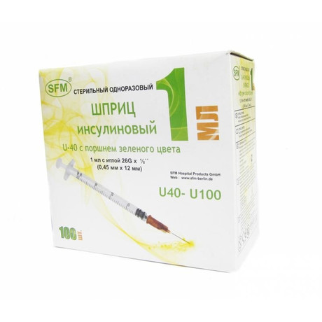 Имеет две шкалы - U-40 / U-100, для инсулиновых инъекций с разной концентрацией инсулина, стерильный с иглой 26G - 0,45x12 мм - коричневая (игла надета на шприц, игла является съемной), расположение канюли - центральное.