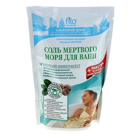 Соль мертвого моря со сбором лекарственных трав, эфирными маслами лавра, вербены и мускатного ореха.
