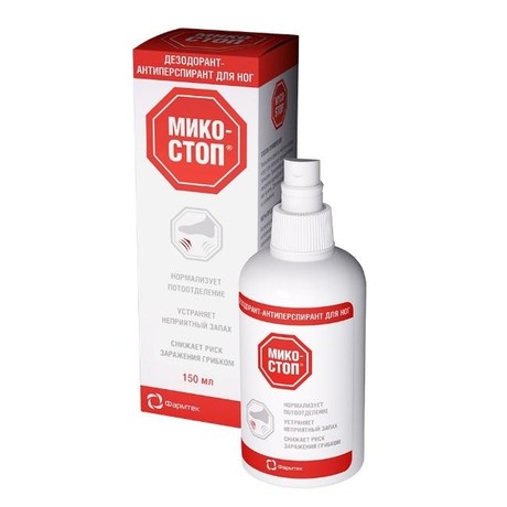 Улучшает циркуляцию крови и лимфы и помогает избавиться от неприятного запаха. Спрей легко наносить на кожу, что позволяет ухаживать за кожей ног вне дома. Это действенное косметическое средство можно использовать несколько раз в день. МИКОСТОП дезодорант-антиперсперант для ног (спрей) для устранения неприятного запаха и нормализации потоотделения. Имеет двойной механизм действия - нормализует потоотделение и подавляет размножение бактерий и грибов. Ежедневное использование также снижает риск заражения грибами, вызывающими микозы стоп.