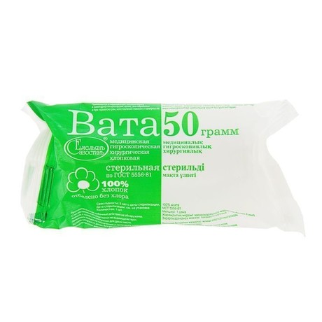 Вата медицинская гигроскопическая хирургическая стерильная. Применяется там, где нет возможности стерилизации, но вата будет соприкасаться с поврежденной поверхностью кожи либо с открытой раной.