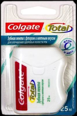 Зубная лента Colgate Total с пирофосфатом натрия и мятным вкусом эффективно удаляет зубной налет и остатки пищи из межзубных промежутков и вдоль линии десен