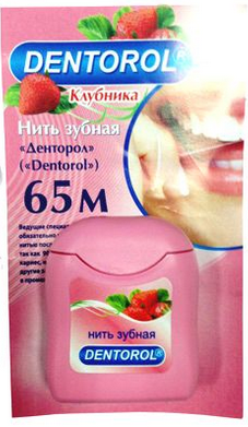 Зубная нить «Dentorol» с ароматом клубники бережно очищает межзубное пространство, вощеная нить не ранит десны и имеет привкус мяты.