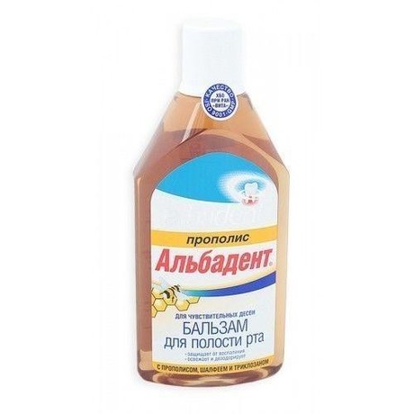 БАЛЬЗАМ АЛЬБАДЕНТ ДЛЯ ДЕСЕН ПРОПОЛИС ДЛЯ ЧУВСТВИЕТЕЛЬНЫХ ДЕСЕН для профилактики пародонтита дезинфицирует и приятно освежает полость рта.